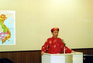 第一部では元ホーチミン日本人学校長の蒔田義信氏が「ベトナムの文化と生活」と題して、ベトナム人の勤勉さと責任感、生活習慣、校長自身のベトナムでの生活のエピソードなどを面白く紹介されました。後半には ベトナムの民族衣装アオザイをまとい、ベトナムの楽器(一弦とニコ)を演奏され、現職の大垣市管弦楽団の一員としてコントラバスを弾く腕前を存分に披露してくださいました。