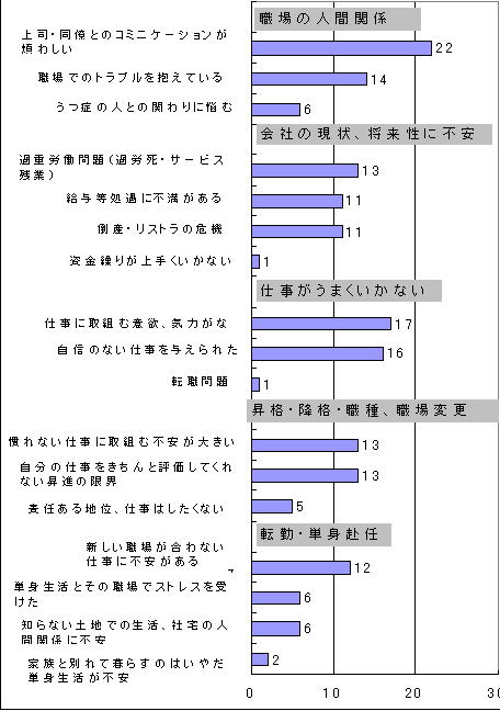 仕事における最大の悩み事は「職場の人間関係」であり、対人関係の悩みが大きいことがわかる。二番目は「会社の現状、将来性に不安」であるが、これは家族にはなかなか理解してもらえない項目でもあろう。一人で不安を抱えるケースが多いと考えられる。