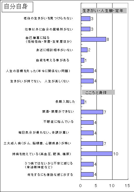 もう一つの項目である自分自身の悩みでは、右掲グラフのように、健康の問題(心の問題を含めて)をそれぞれが抱えて生活していることがわかる。「 生きがい」 の項目の中にも心の問題が含まれている。男性にとっても心の問題の重要性がわかる。禁酒・禁煙が出来ないことを悩みとして抱えている男性も構成比としては多い。