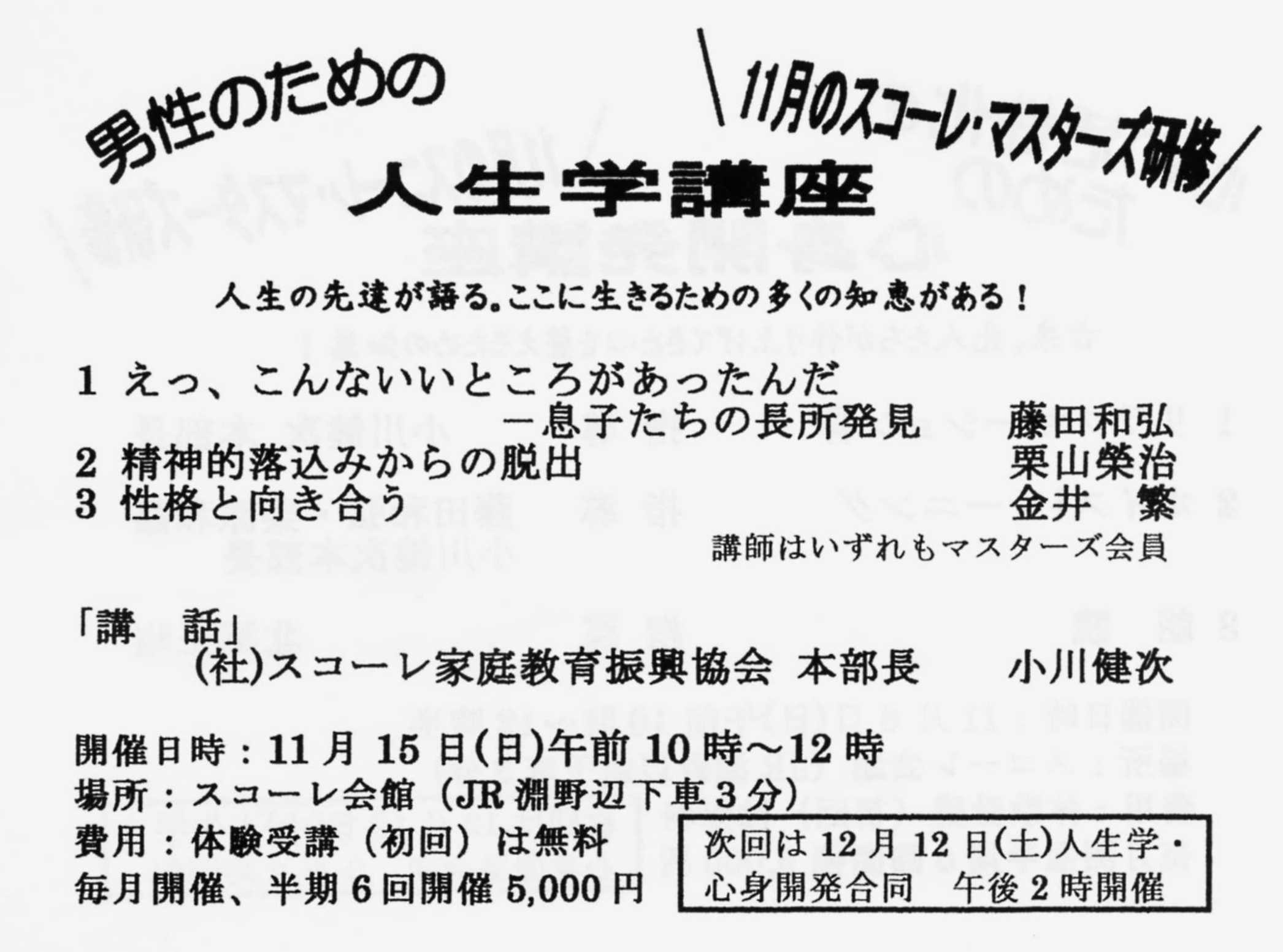 平成21年度11月度のマスターズ研修の日程です。8日(日)は心身開発トレーニングコース、15日(日)人生学コースです。お間違えなきようお願いします。体験受講も随時受け付けております。