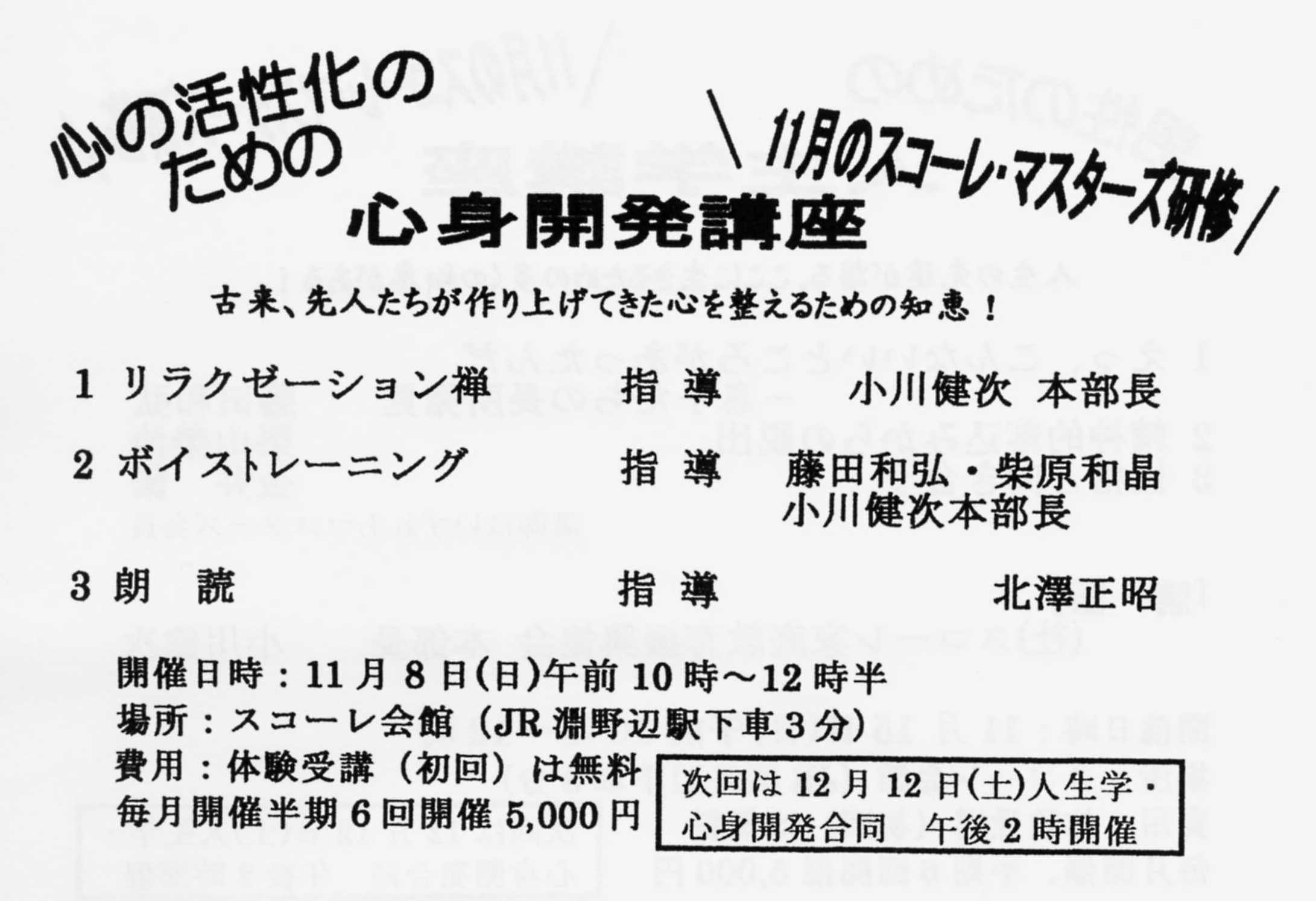 本年度マスターズ主催『生きがい講座』の案内です。 今年は、新スコーレ会館で、永池会長にご講演いただきます。